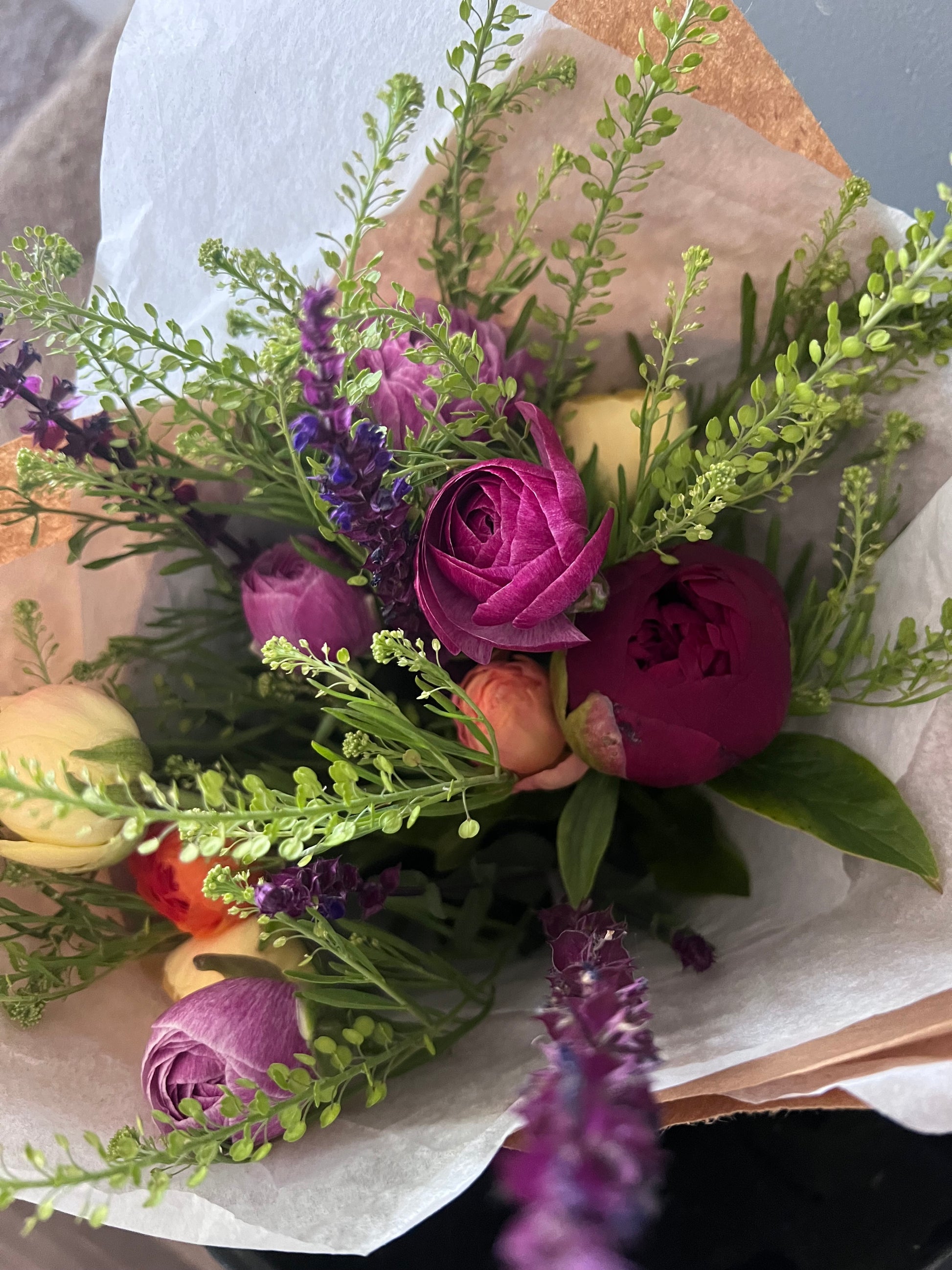 - Beautiful seasonal blooms consisting of Stock, Peonies, specialty daffodils, and a wide variety of aromatic greenery and fillers!