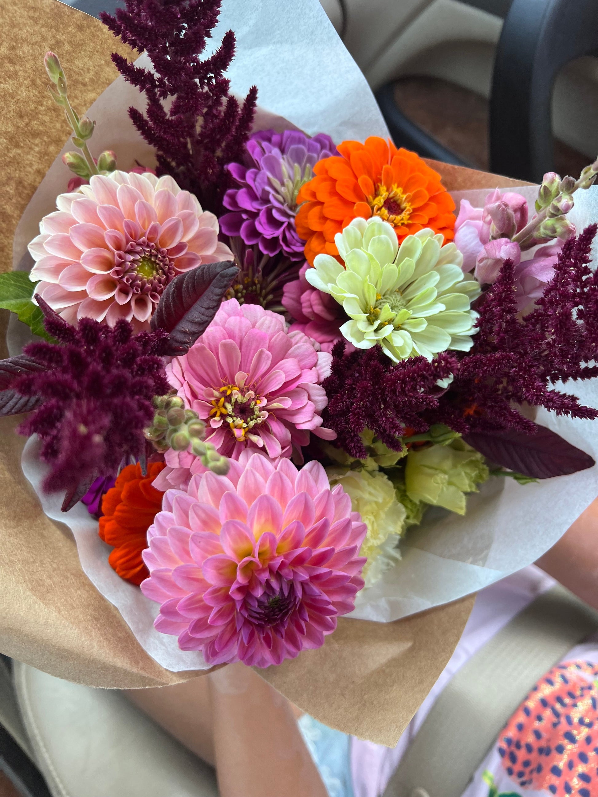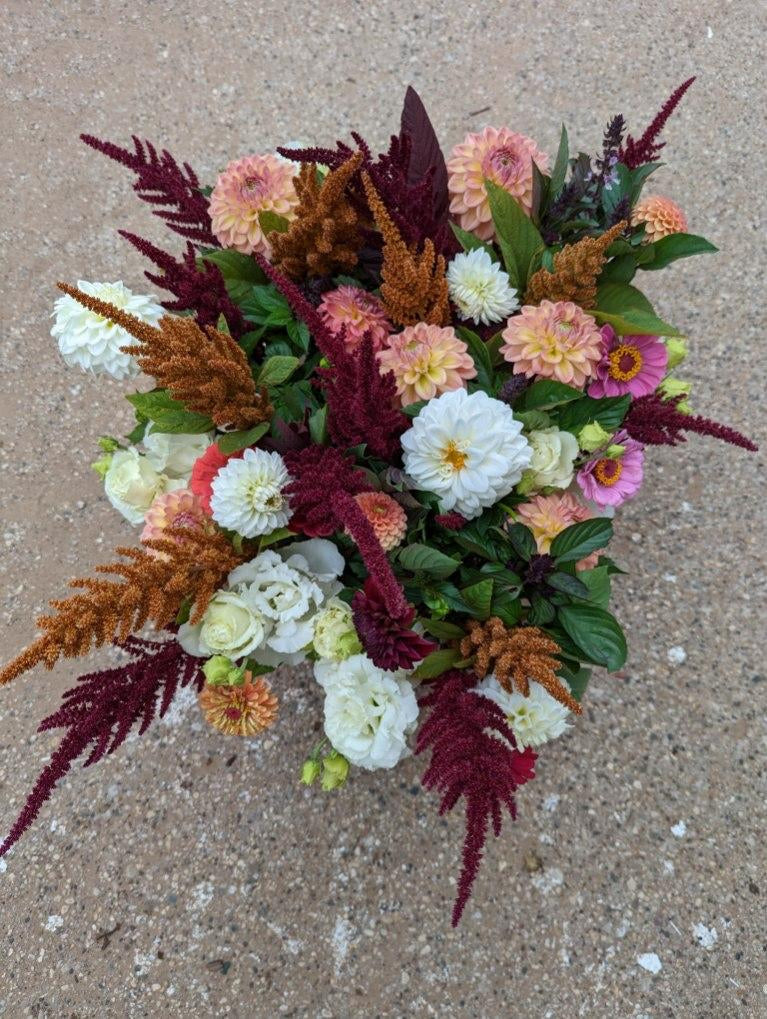 - Beautiful seasonal blooms consisting of sunflowers, snapdragons, specialty zinnias, dahlias, and a wide variety of aromatic greenery and fillers!